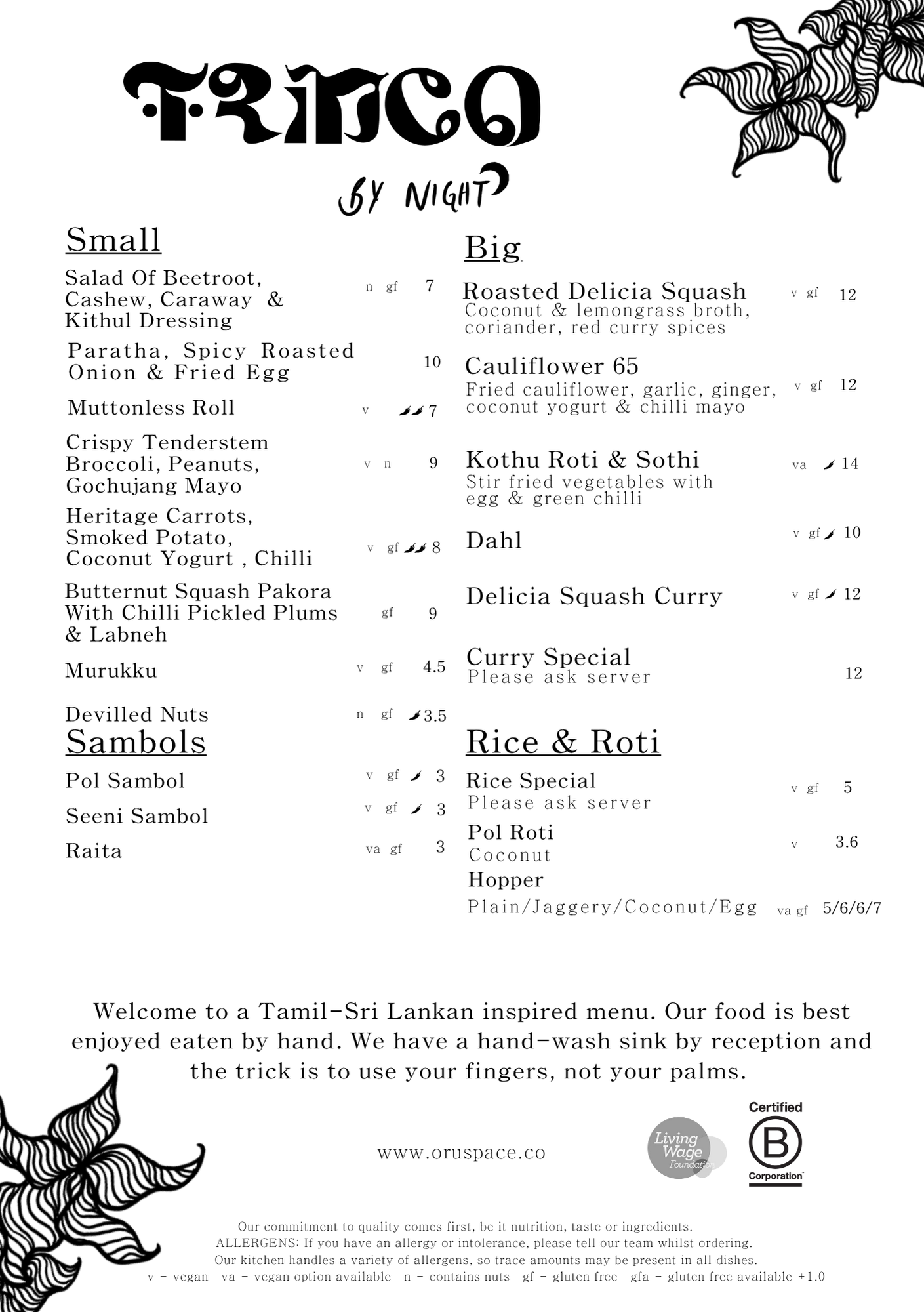 A menu titled 'Trico by Night' featuring various dishes categorized as 'Small,' 'Big,' 'Sambols,' and 'Rice & Roti,' with a decorative leaf design in the corners and text describing the dishes and ingredients.